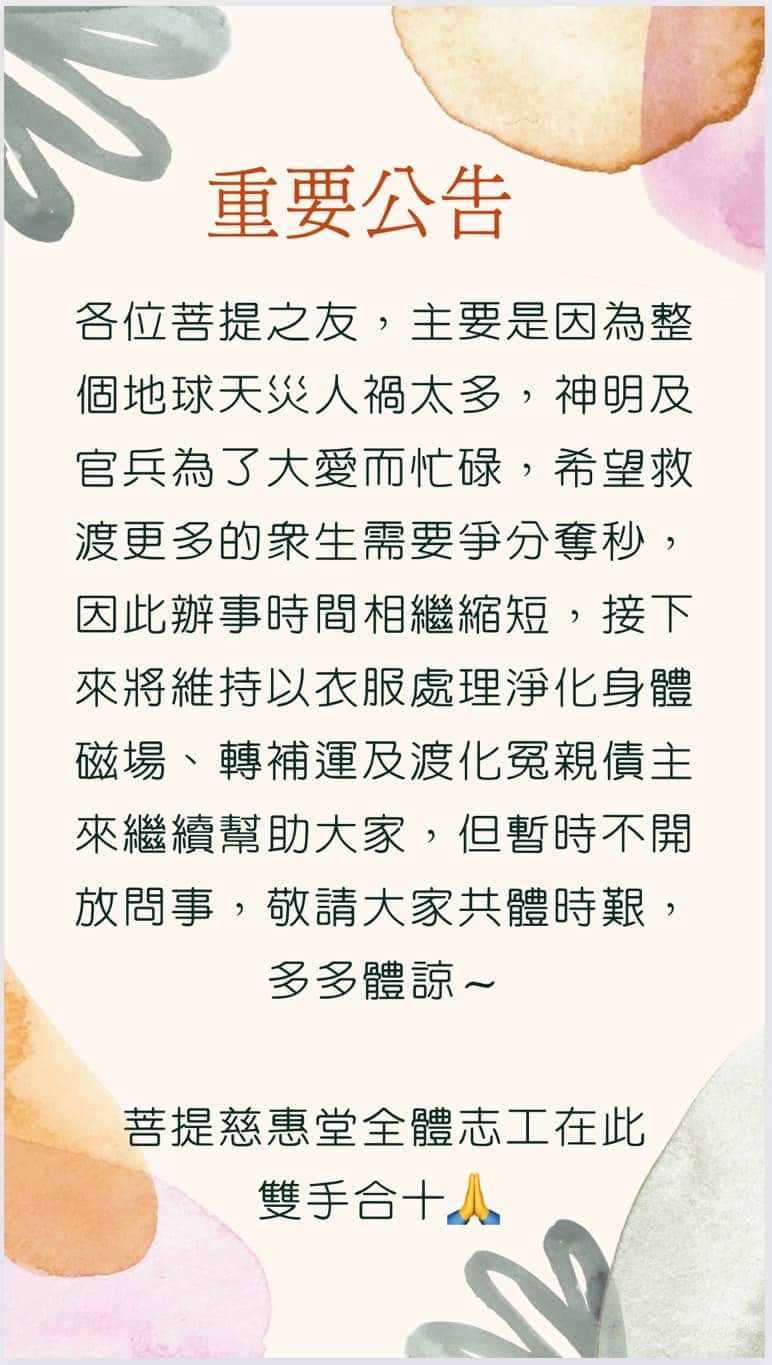菩提慈惠堂的問事預約方式是以當天網路線上預約,可預約時間為有辦事日(辦事日請參考行事曆)當天早上7:00~下午2:00。
